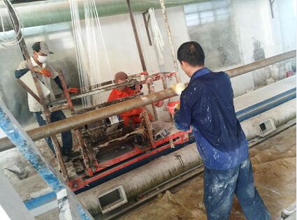 工人往辊上涂刷树脂,这是制作玻璃钢管道内层的关键